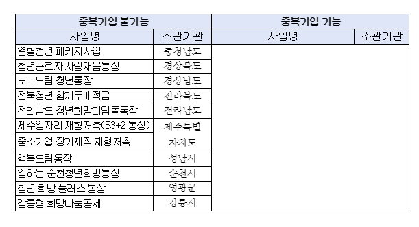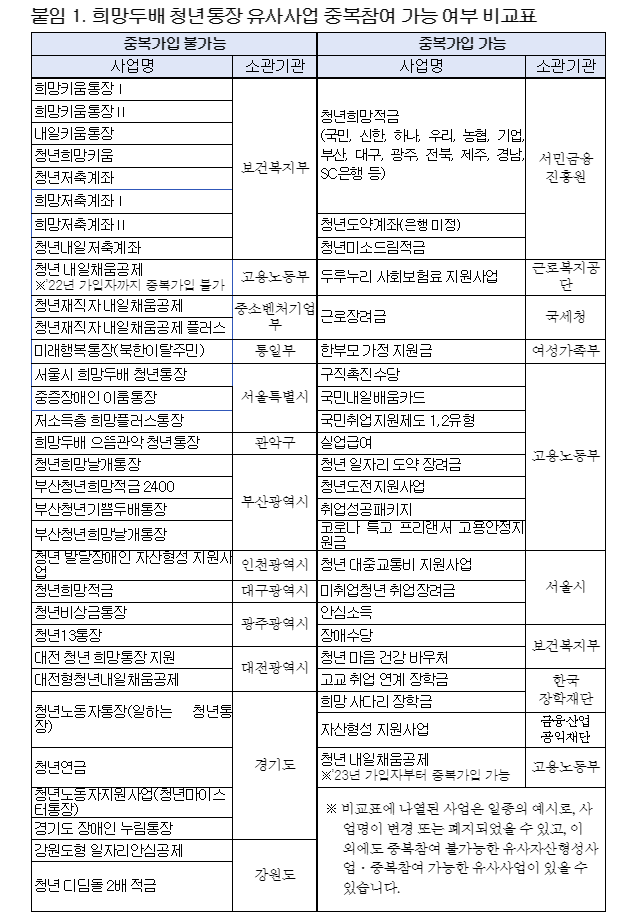 희망두배 청년통장 중복참여 가능 여부를 알려주는 비교표 입니다.